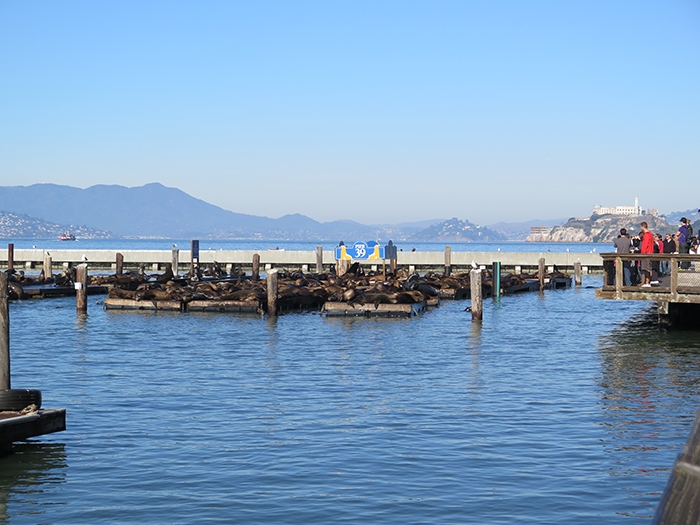 an outdoor restaurant along Fisherman's Wharf, with the ever-present sea lions